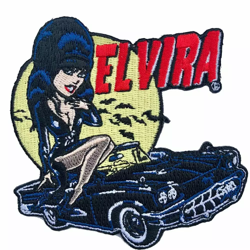 Official Elvira Mistress of the Dark patch by Kreepsville, featuring a vintage inspired embroidered design by Vince Ray with an iron on backing! Size approx. 3.5 W (9 cm) x 3in H (8 cm)