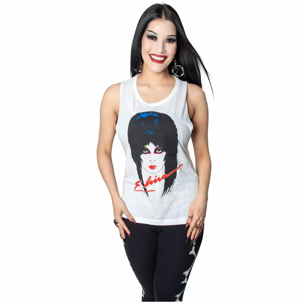 Elvira 1987 reprint sleeveless tee by kreepsville, slub loose fit sleeveless tee with screened Elvira mistress of the Dark design .Officially licensed Elvira Mistress of the Dark merchandise made in the USA.Â