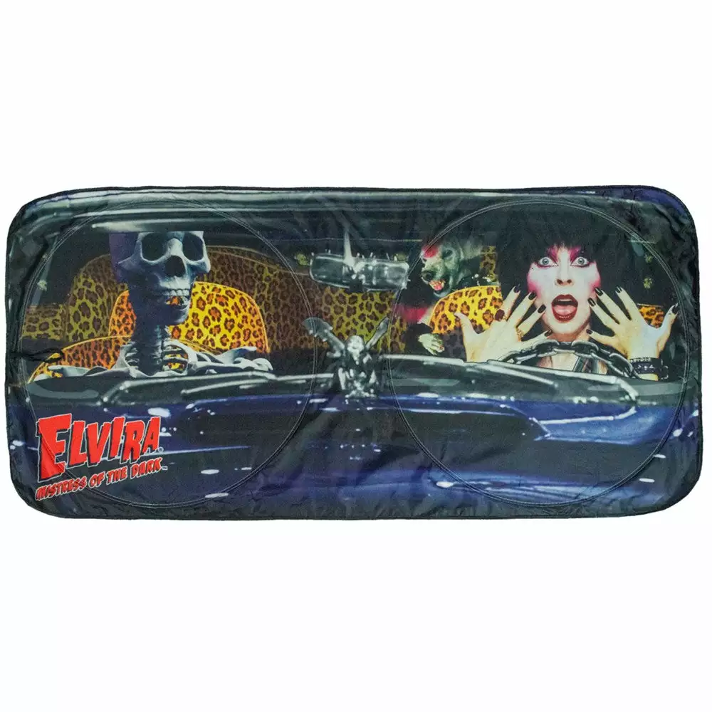 Sun protection has never been so sexy! Keep the sun out of your eyes and Elvira by your side with this Officially Licensed Elvira Car Sun Visor Macabre Mobile by Kreepsville. Featuring the stunning Elvira Mistress of the Dark with her ghoulfriend Gonk and bony buddy inside her macabre mobile. This visor will protect your flesh from burning on the hottest of days, blocking harmful UV sun rays! Includes a convenient Elvira storage pouch for safe keeping. Sizes approx 57″ (L) (144cm) x 28″ (W) (71cm).