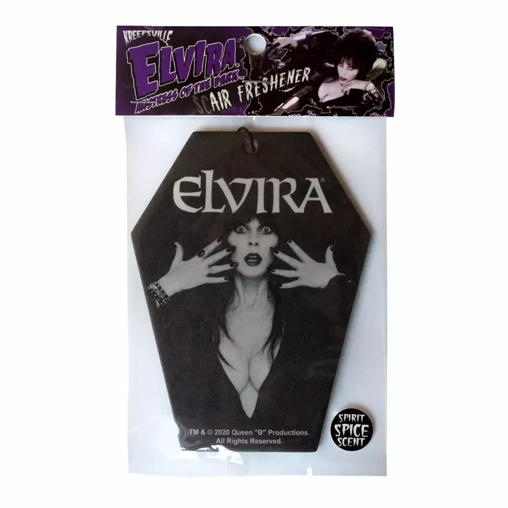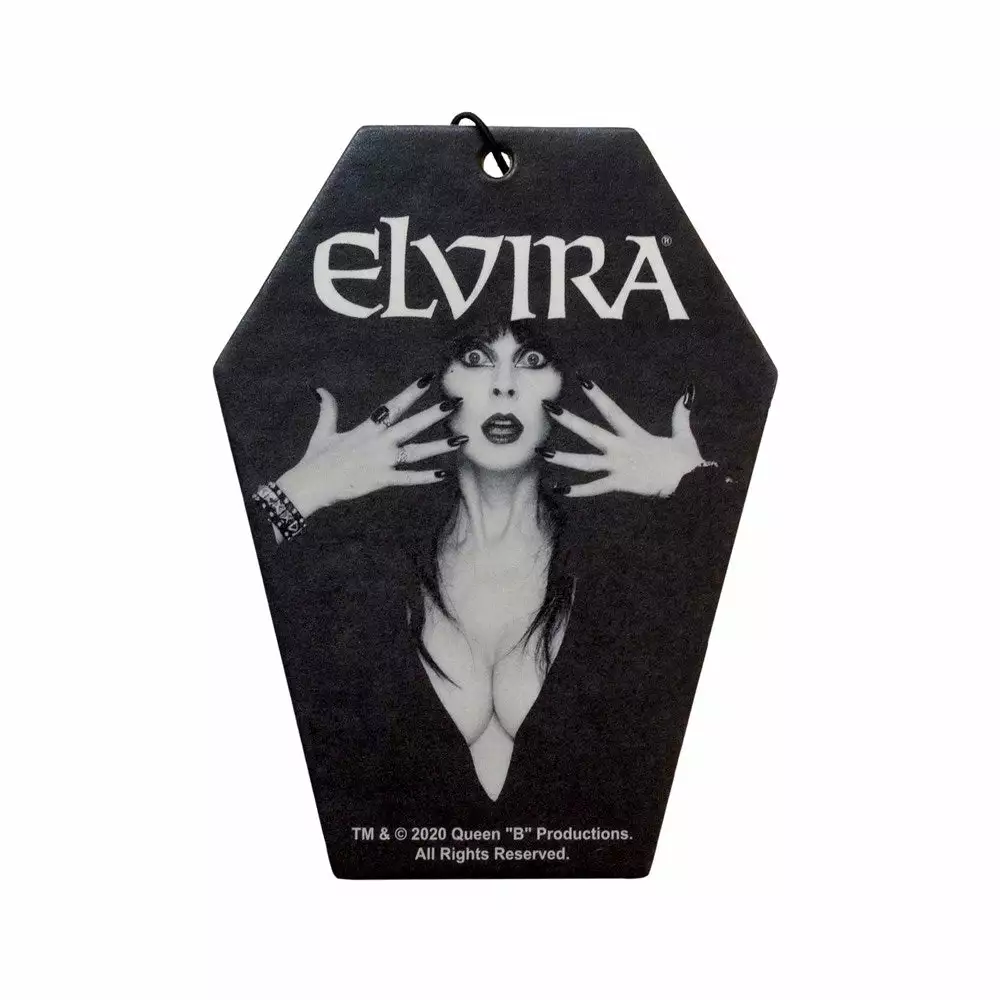 An occupied coffin have never smelled as fresh as our officially licensed Elvira Coffin Classic Air Freshener with a spirit spice scent. approx. 3.75″x3″ (9cm x 7 cm)