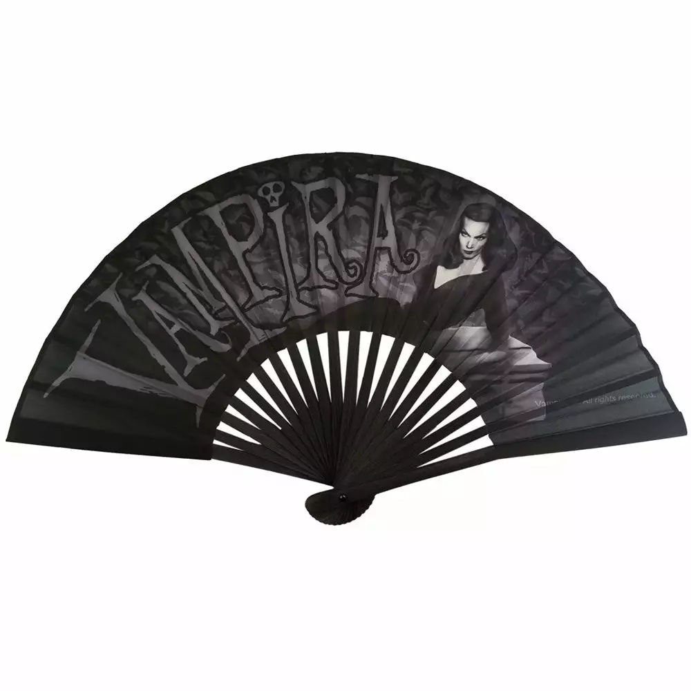 Vampira Coffin Fabric Fan by Kreepsville is the perfect way to show your allegiance to Vampira’s Ghoul Gang! This officially licensed fan features a seductive Vampira in all her vampy elegance. The fan is made of high quality fabric and black bamboo frame. Expands up to 16″ inches (40cm) x Height 9.25″ inches (23.4cm).