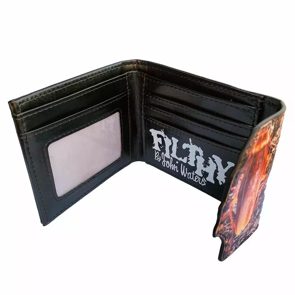Get filthy! with your John Waters Filthy Roach Bifold Wallet with an ID slot, slots for cards and velcro fastening. Outside the design features rouches and trash to match your filthy soul.