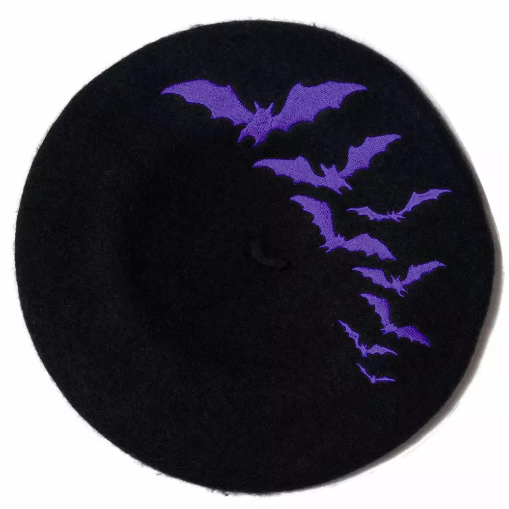 Go batty with Kreepsville’s beatnik berets! 90% wool 10% polyester berets, embroidered bat motif on top and front. One size fits most.