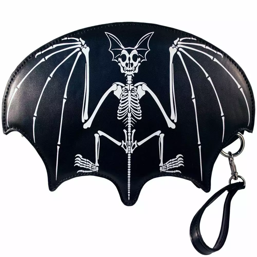 This Wristlet is BAT to the bone! Â Kreepsville 666 Battitude Wristlet is bat shaped with our skeli-bat printed on the front and “Battitude” printed on the back. Includes detachable shoulder strap. 9.5 inch wing span by 7 inches.