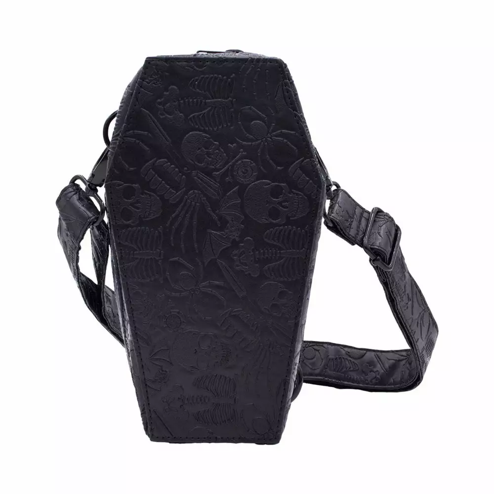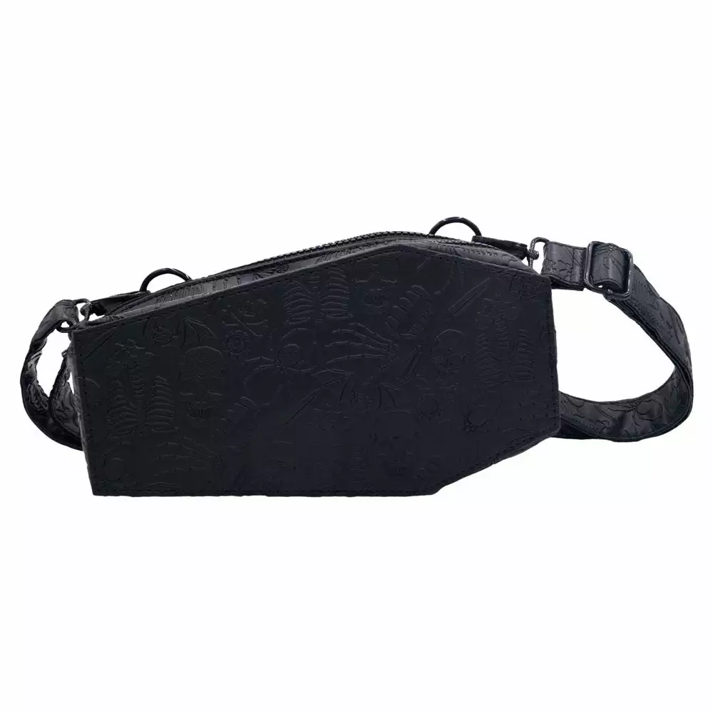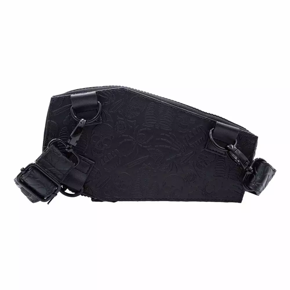 NEW design!! Convertible coffin Hip Pouch, Shoulder Bag, Crossbody wear it how you choose!! Made of vegan leather embossed with a repeating pattern of skulls, bones, bats, fangs, and other things that go bump in the night. Measuring approx. 9IN X 6IN X 2.5 IN with three D rings in the back and clips on the straps so you can use it many ways, with two zippered compartments a large one in front and a small one with an id holder in the back!Â