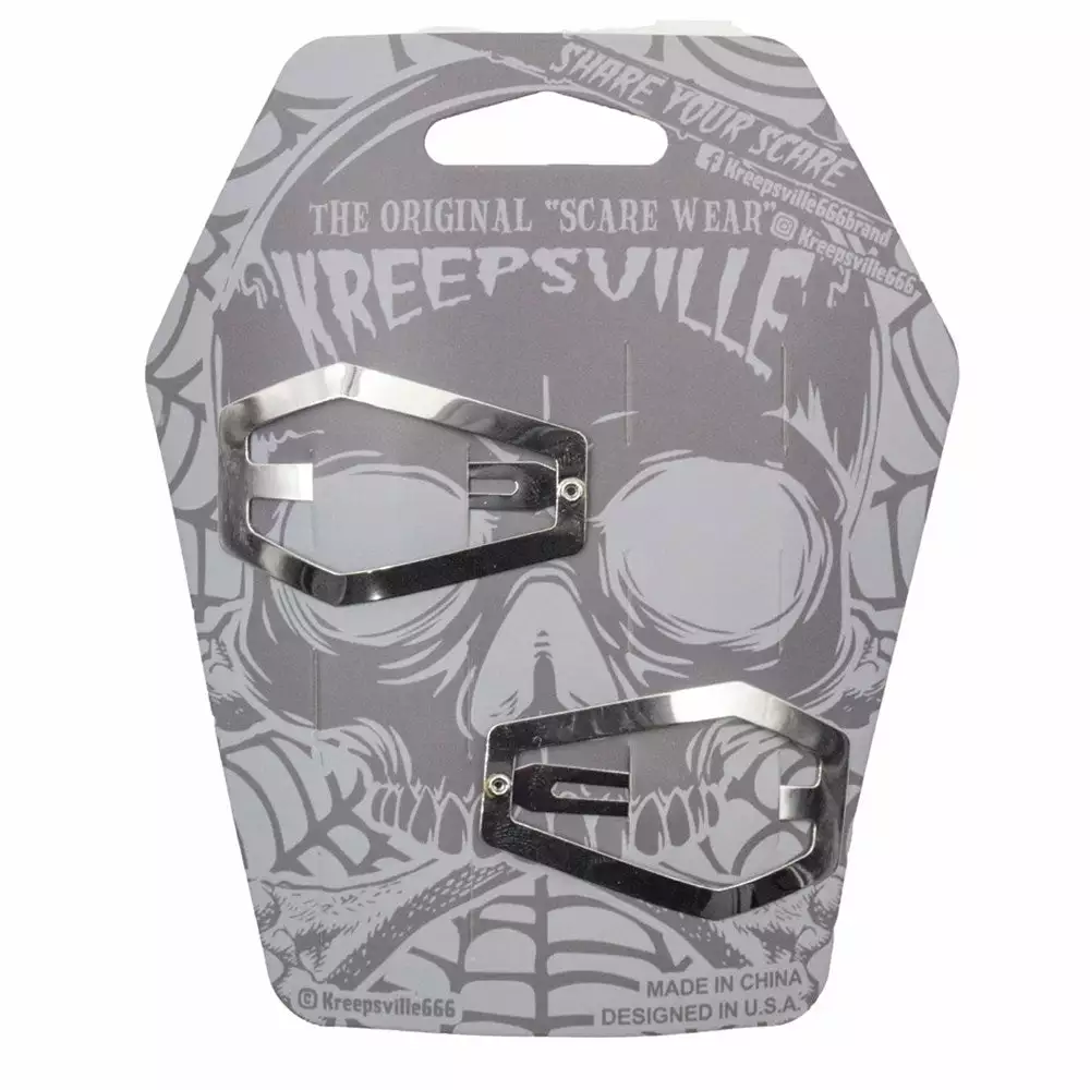 Kreepsville Coffin Snap Hair Clip Silver. Come out of your coffin shell and feel alive in our coffin shaped hair clips, made with alloy metal. Designed by ghouls in the USA! Clip size: 2″ (5cm) x .9″ (3.0cm).