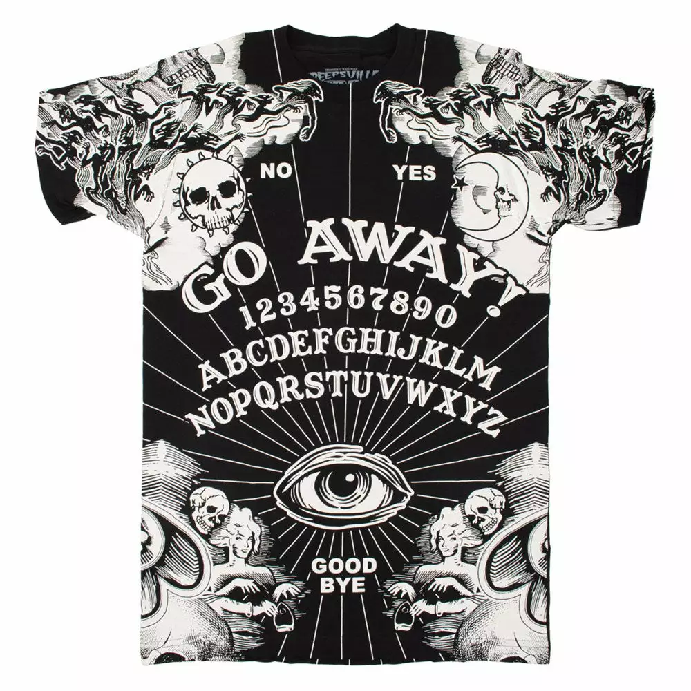 Kreepsville Jumbo Go Away Men’s T-shirt featuring an all over jumbo discharge print of Kreepsville’s go away ouija design, printed on 100% cotton. Made by monsters in the USA.