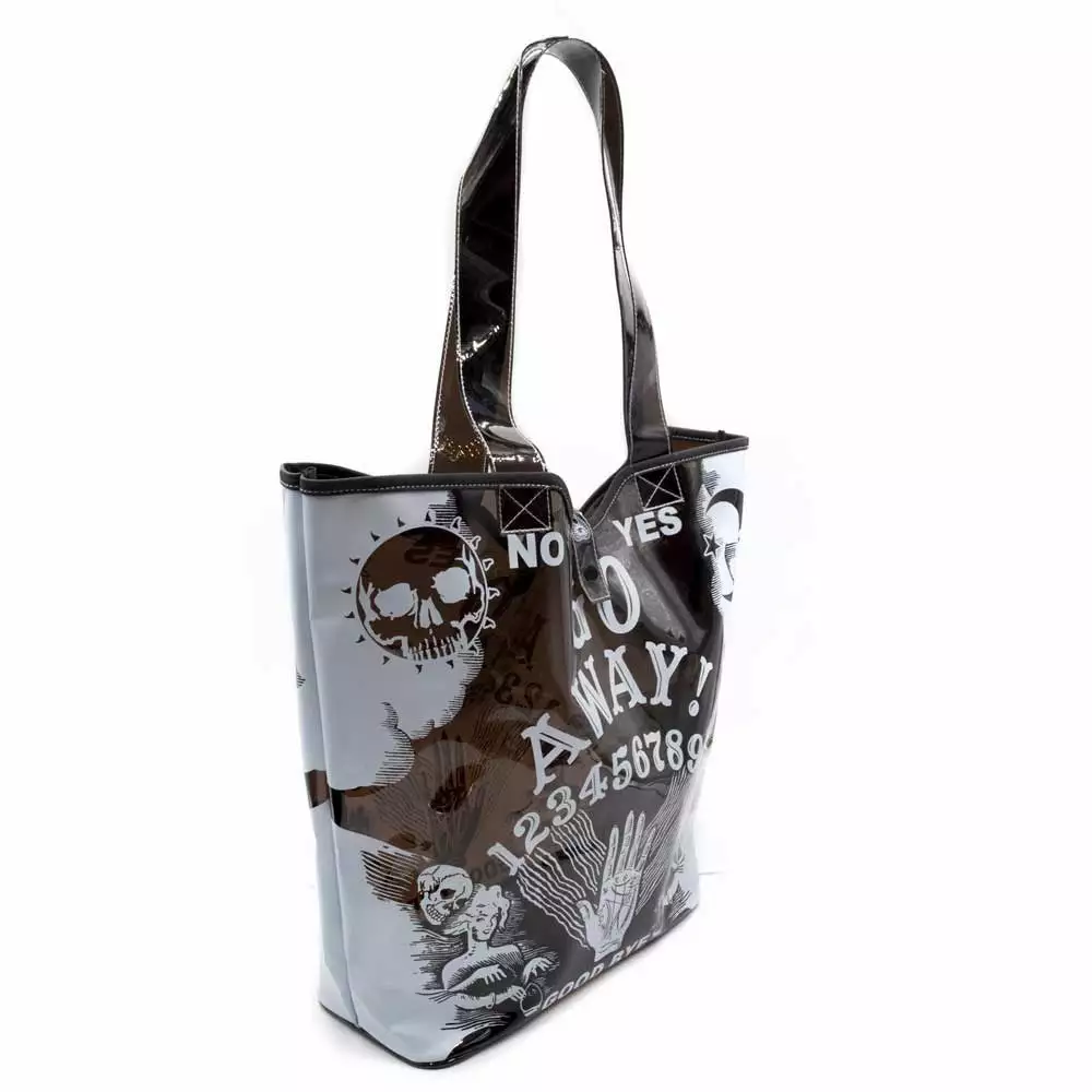 Summon the summer spirit with our Go Away Ouija PVC Beach Tote. Tote is made of translucent PVC with go away ouija print an snap closure. Â Tote Measures 19in (48cm) W x 15in (38cm) x 5in (33cm x 13cm)