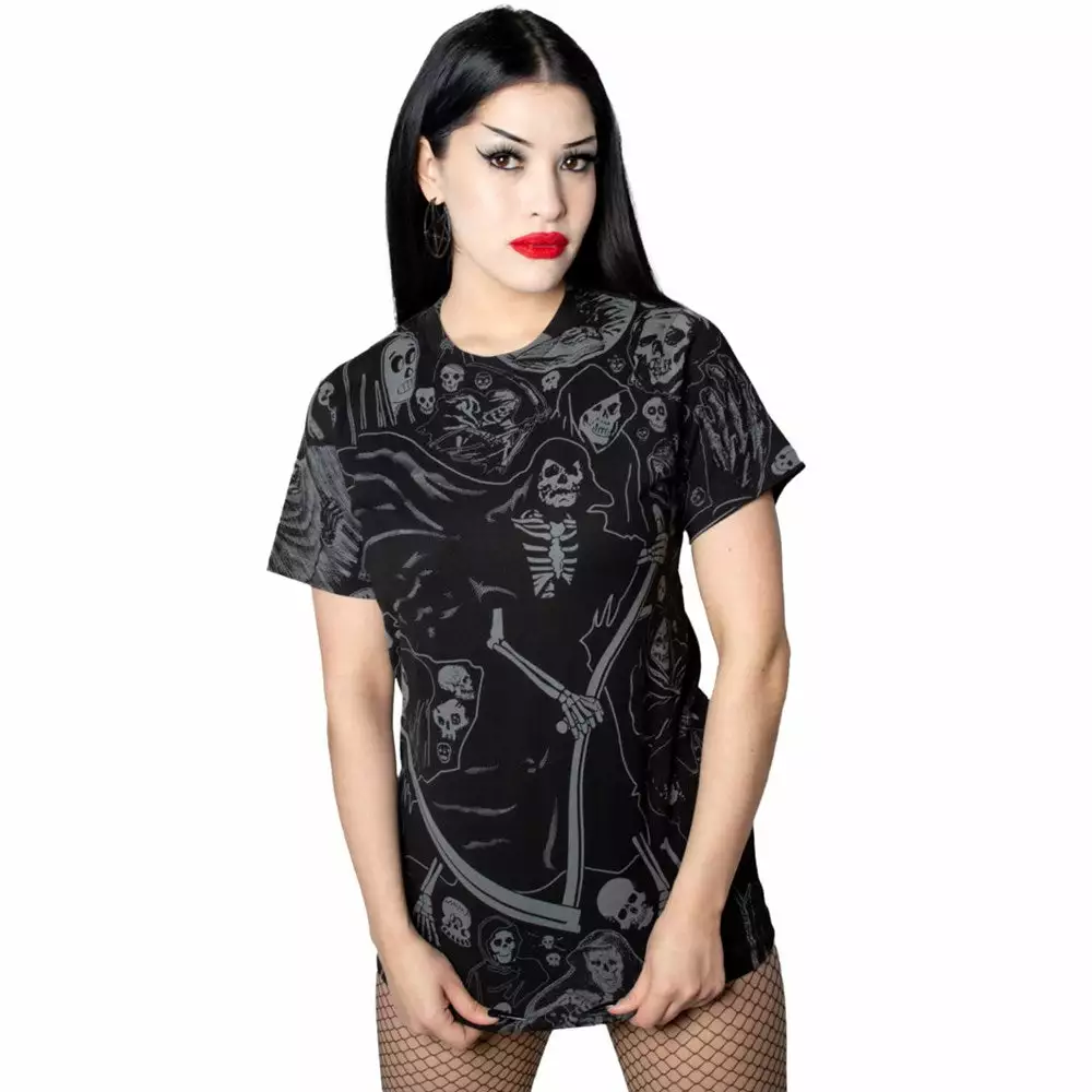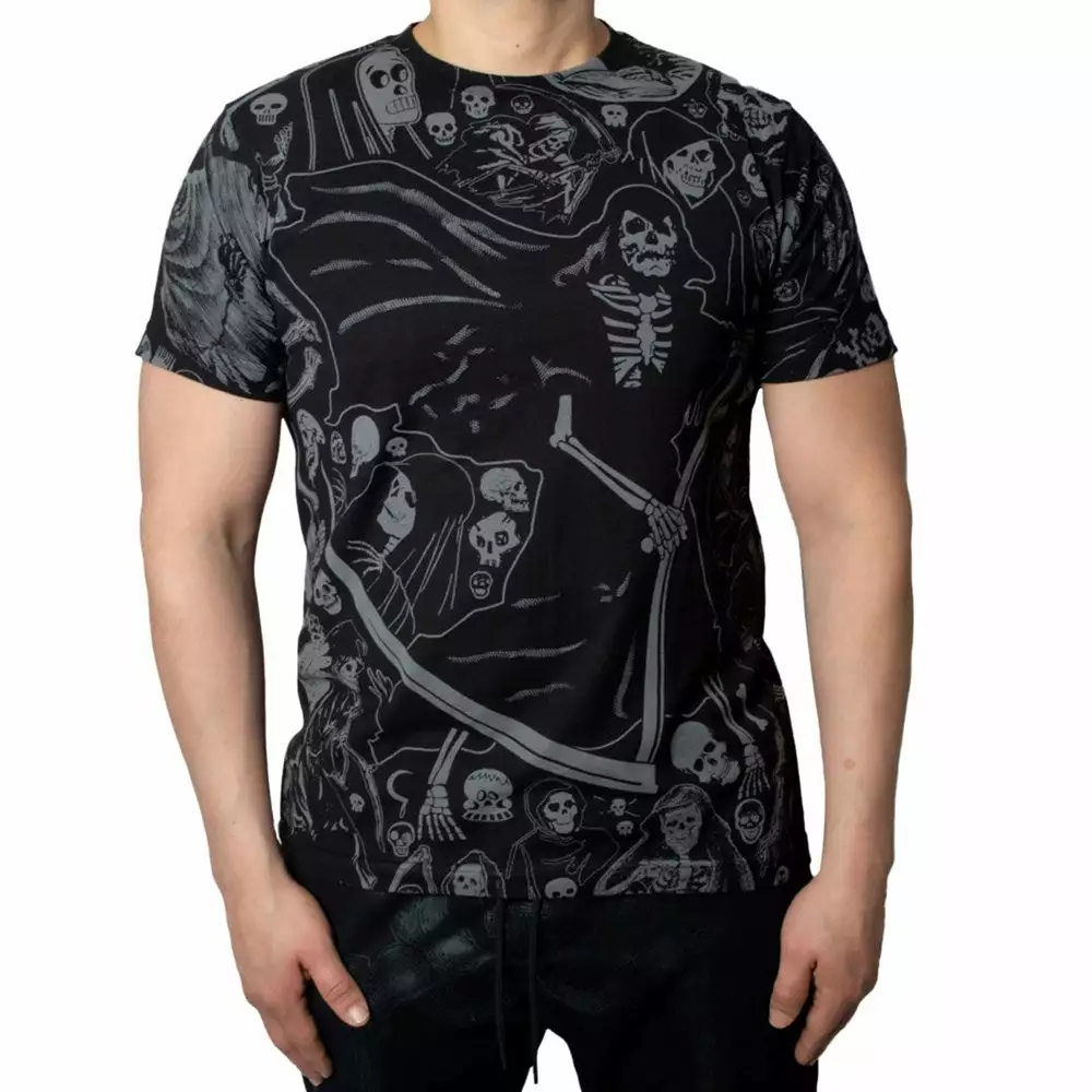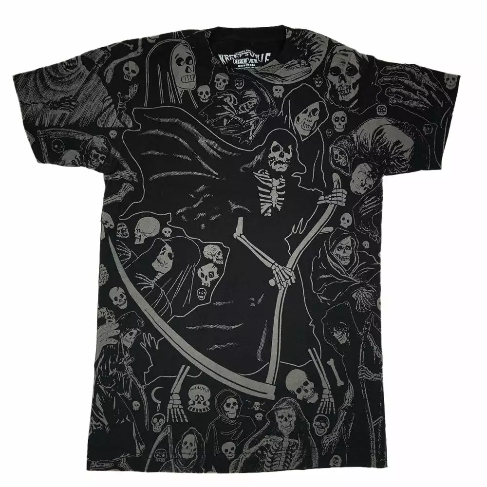 Kreepsville Grim Reaper Grey Jumbo T-Shirt. The perfect t-shirt for anyone who loves skulls, monsters, death and all things creepy. Features a soft-feel discharge all over front print on 100% cotton fabric. Designed and made by The Reaper in the USA, it will keep you looking cool while making your friends think twice about messing with you!