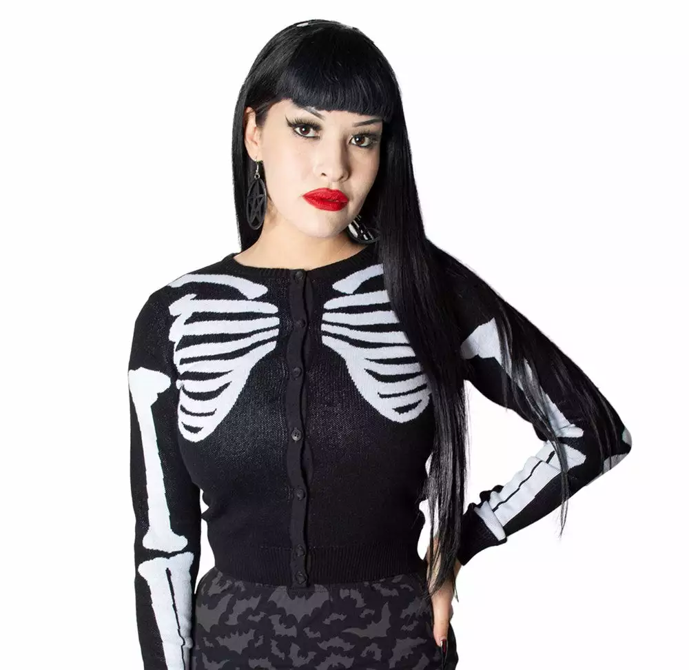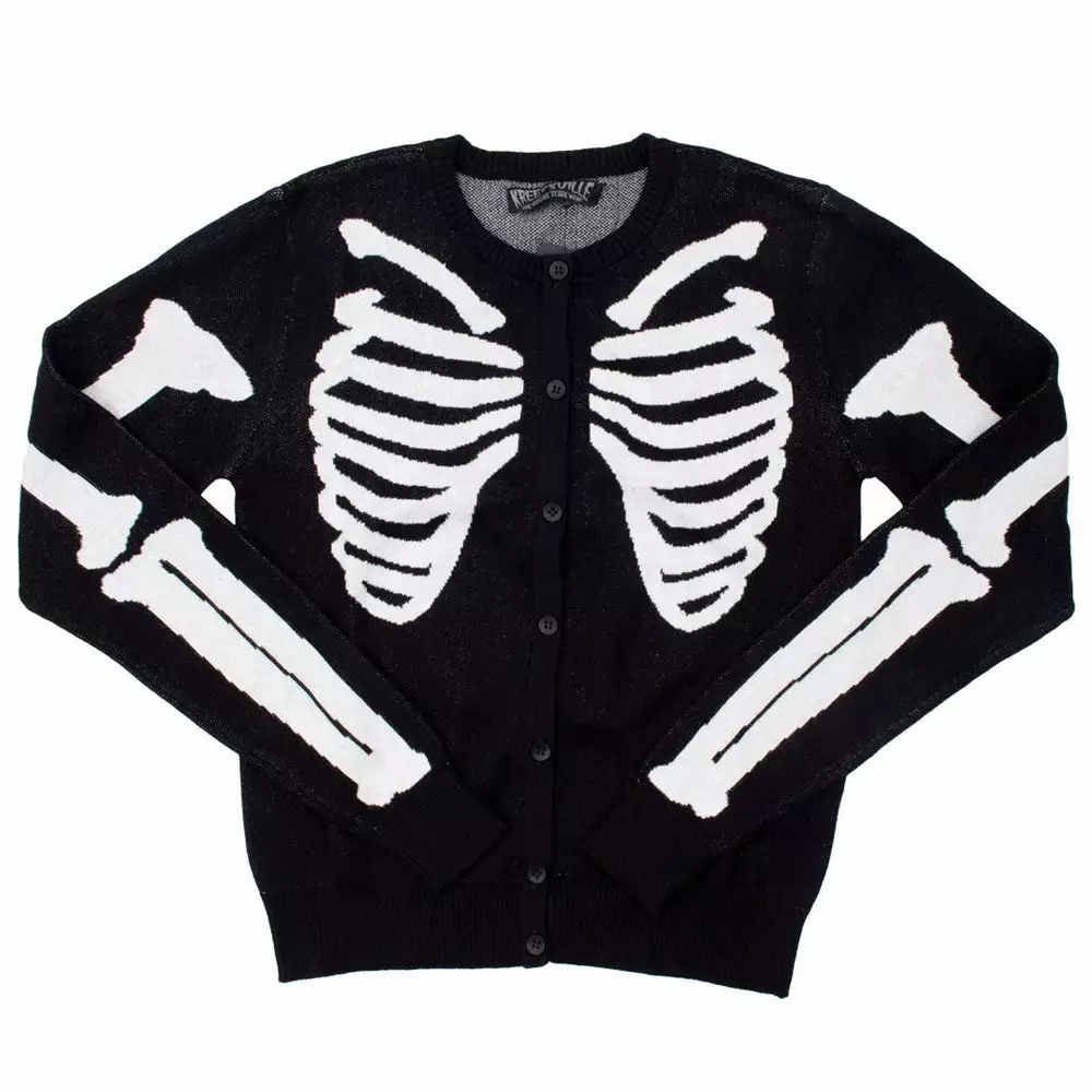 Kreepsville button down Skeleton Ribcage Bones Cardigan , with white knit ribcage design on the front and back and bone details down the sleeves made out of  100% cotton.