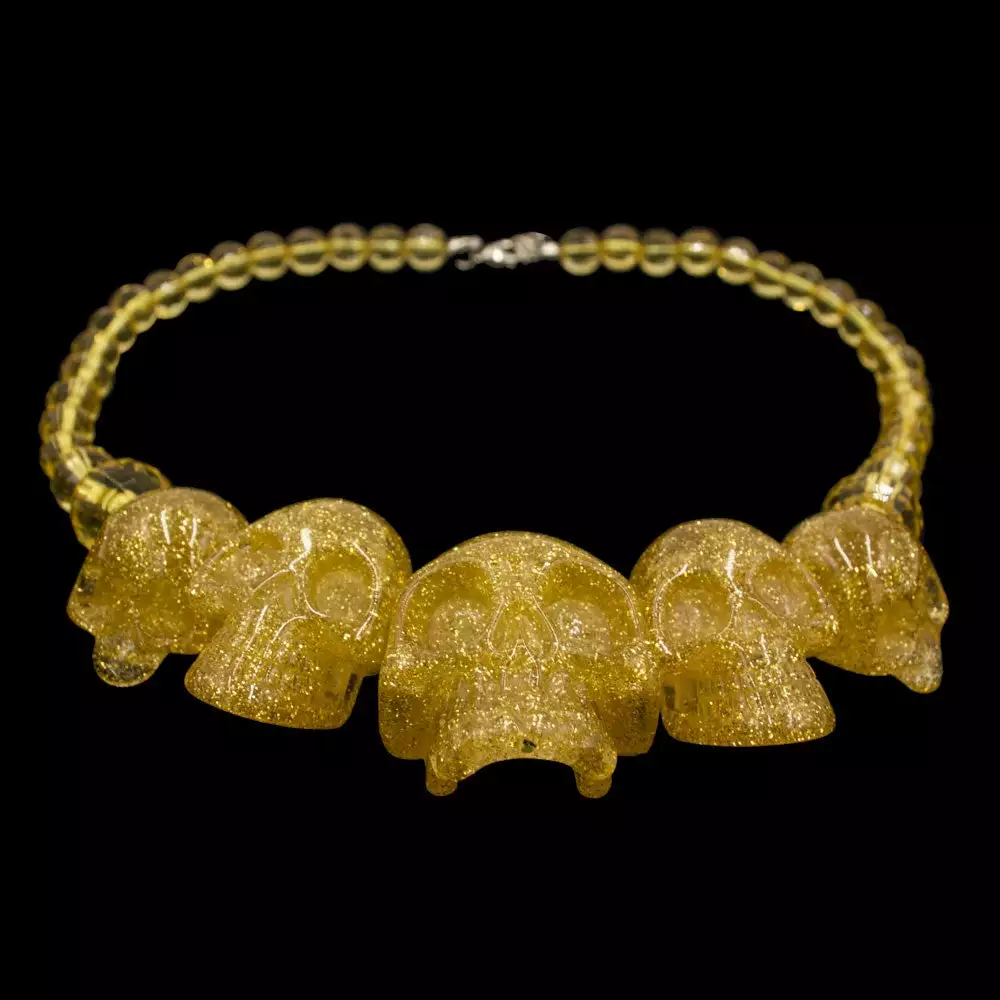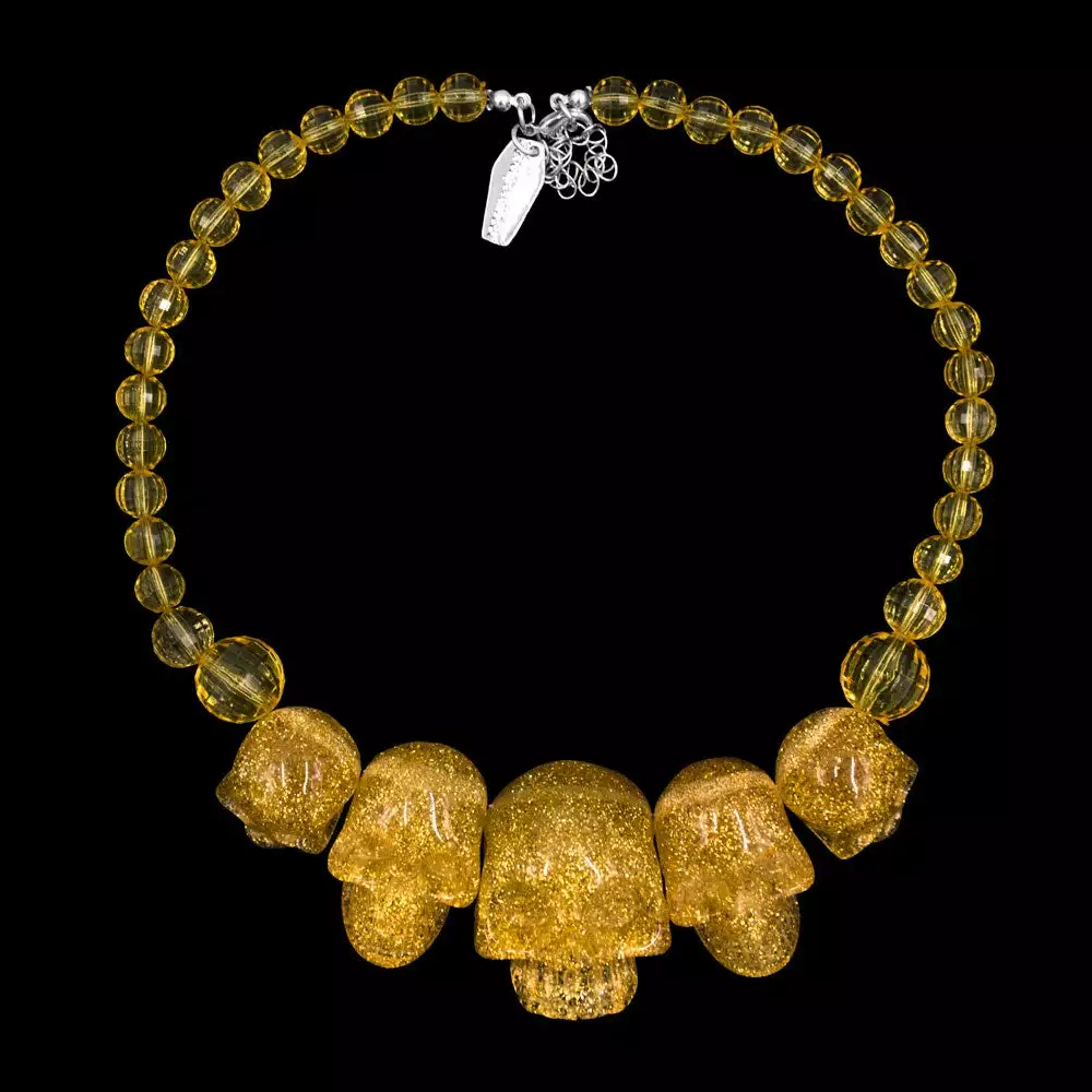 Kreepsville 666 Skull Collection necklace in Gold Glitter, Â clear resin skull beads mixed with gold glitter though out with neck extender and coffin charm, size of large skull approx 1.75″ high