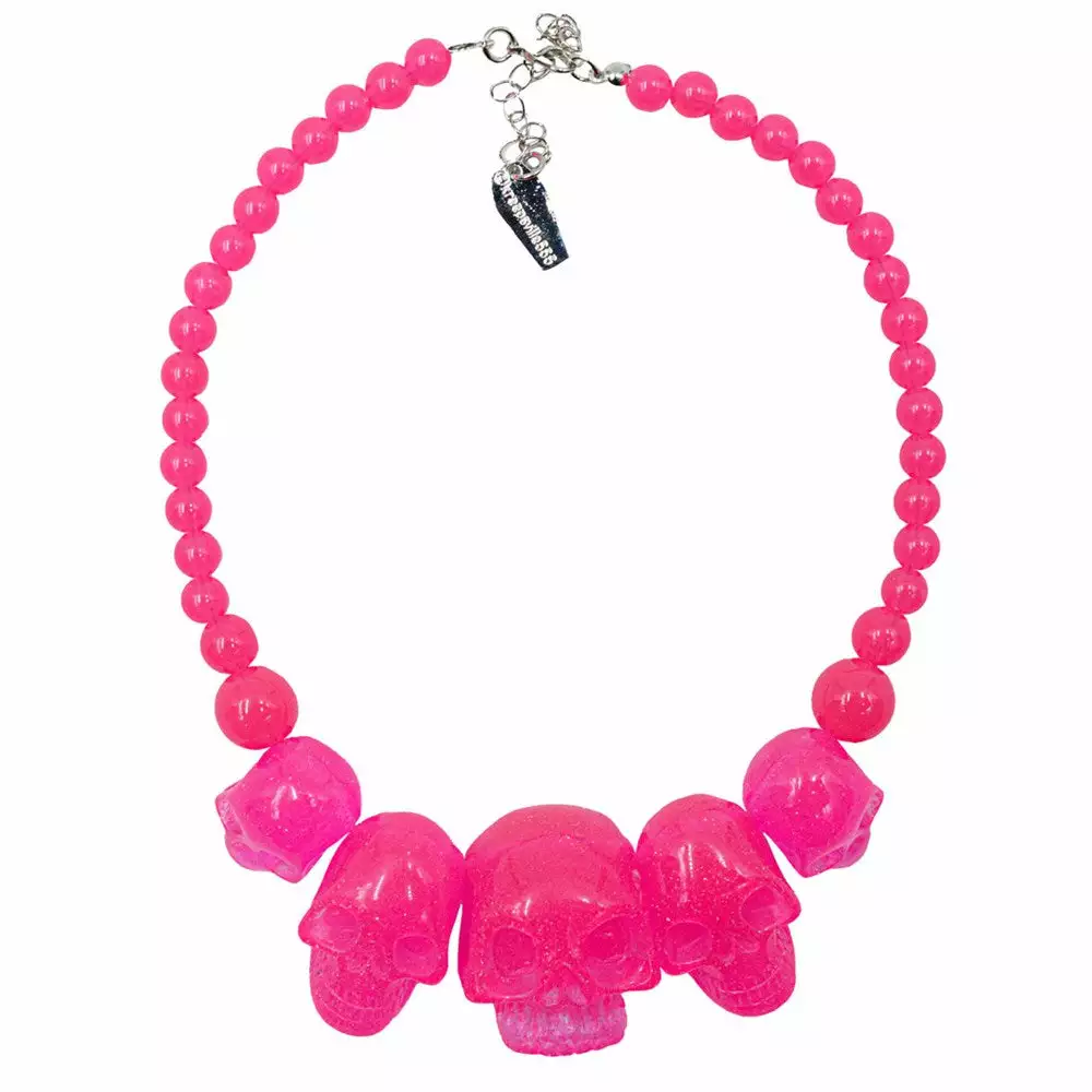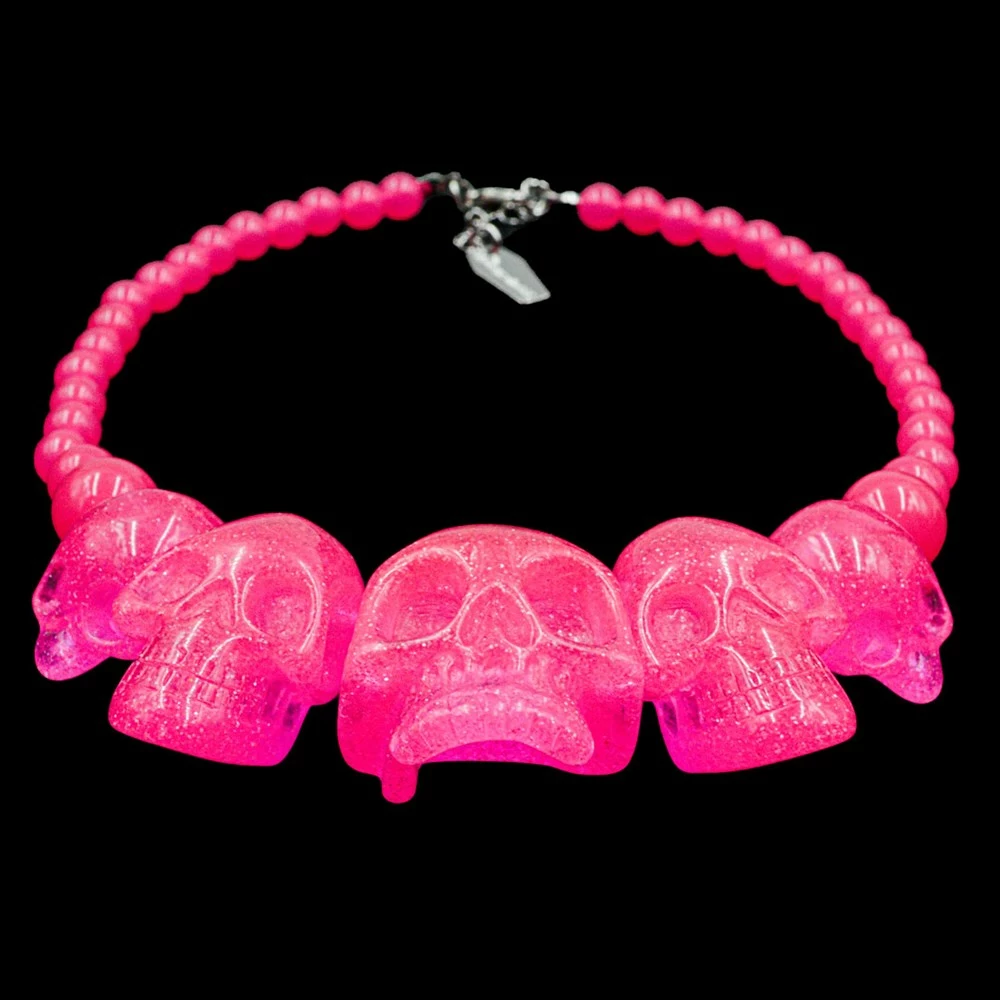 Kreepsville Skull Collection necklace in pink glitter, semi-transparent resin skull beads mixed with pink glitter through out with neck extender and coffin charm, size of large skull approx 1.75″ high