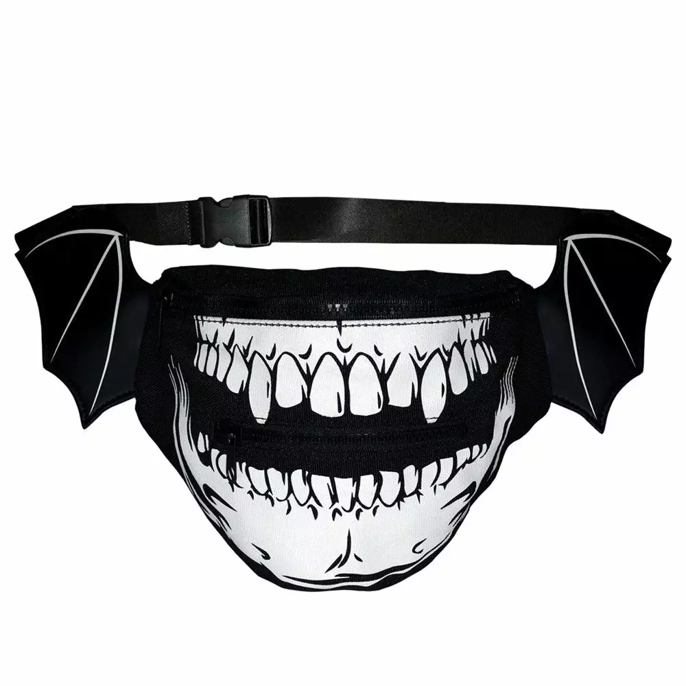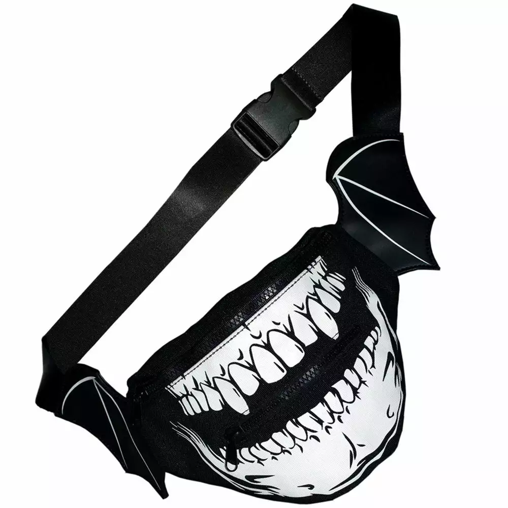 Sink your teeth into this Skull hip pouch! Featuring an adjustable strap and large clip with vegan leather wings and a canvas pouch printed with a white vamp skull print. Measuring approx. 6IN X 10IN X 2IN with two extra zippered compartments a small one in front and a large one in the back! Adjustable strap extend up to 33 inches. Â This is not your granny’s fanny pack!