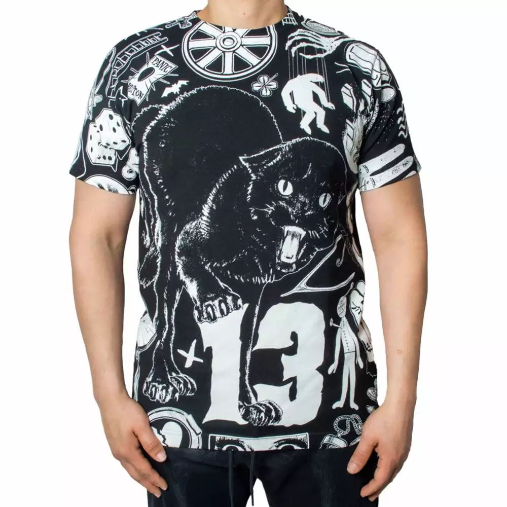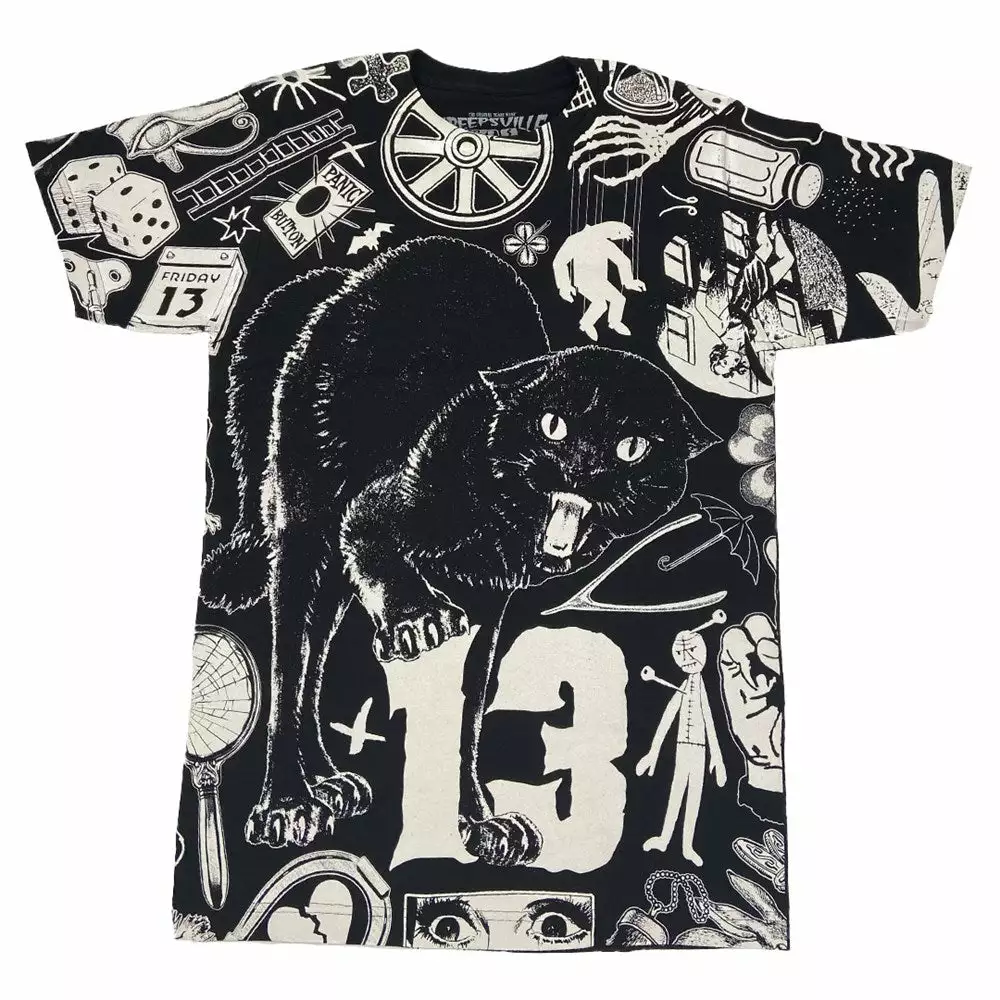 Kreepsville Superstitions Cat Jumbo T-shirt. Test your luck and tempt fate, full front print featuring a large black cat on top of a number 13, surrounded by other superstitious-themed icons in soft-feel discharged print on 100% cotton. Designed and infused with luck in the USA!