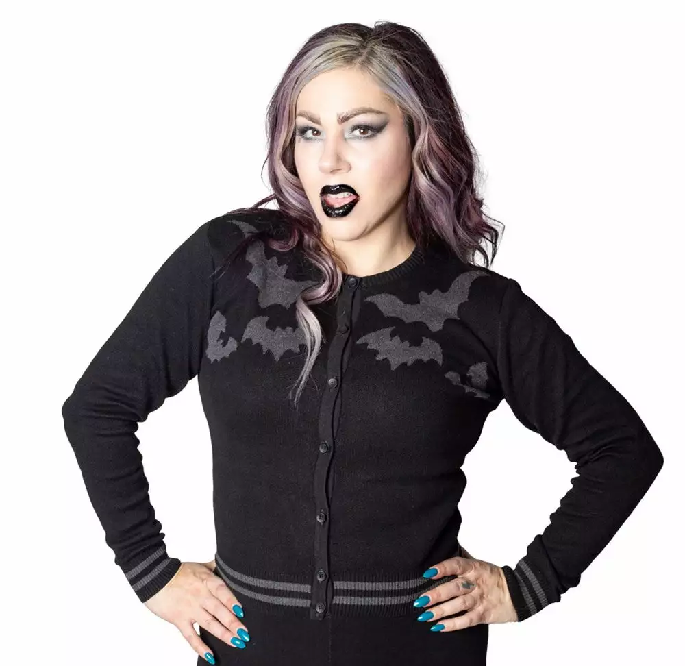 Kreepsville button down Bat Flock Grey cardigan , with grey knit bat designs on the front and back and striped grey cuff details made out of 100% cotton.