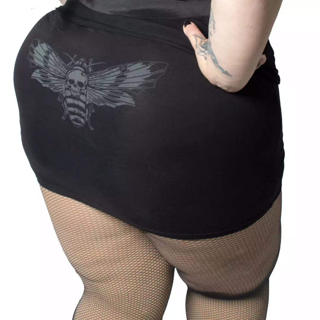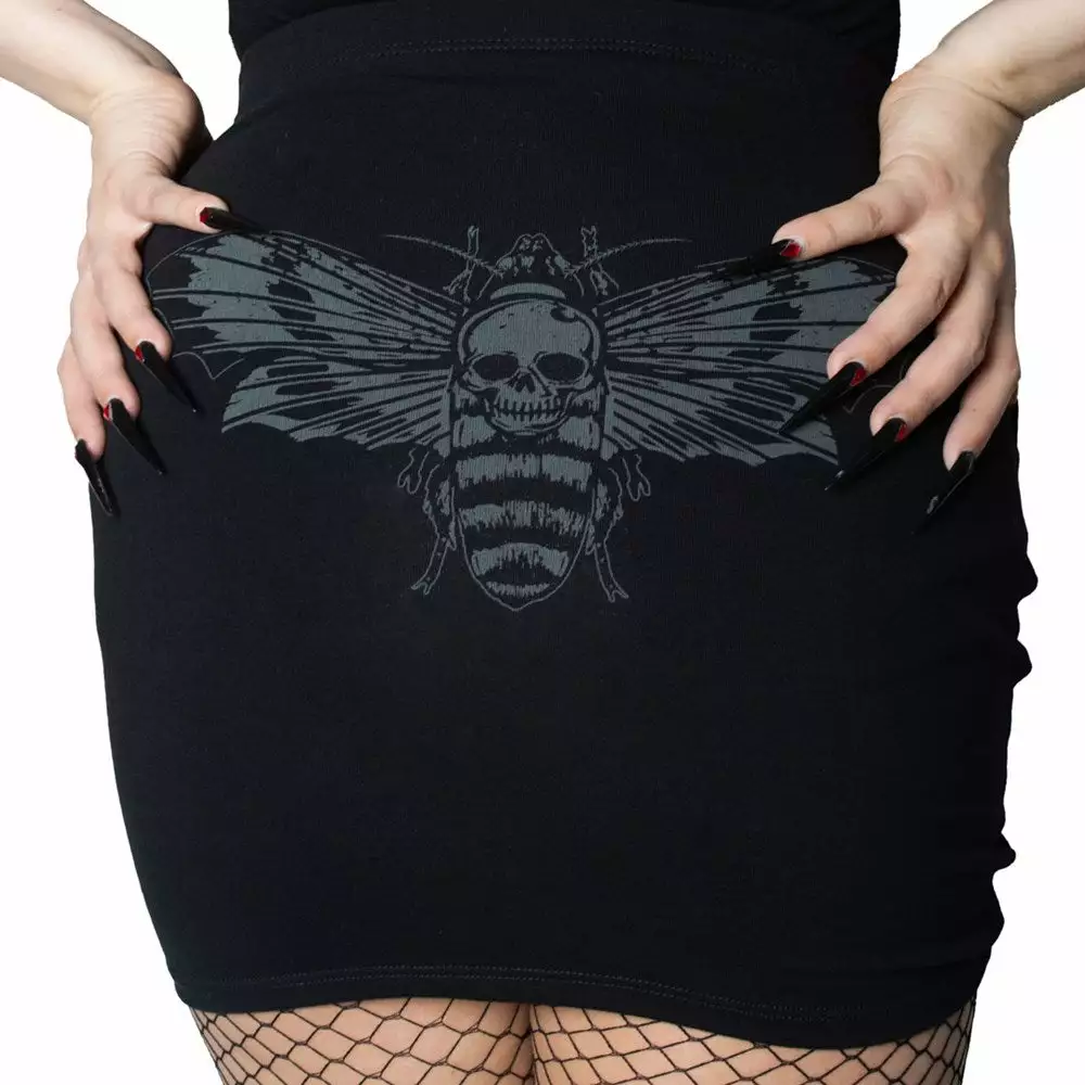 Looking for a unique and stylish way to show off your dark side? Then check out the Kreepsville Death Moth Mini Skirt, this super cute and comfy skirt features a small skull-faced moth detail on front, and a large version on the back. The soft, elastic waistband ensures a comfortable and snug fit, while the soft cotton construction keeps you cool and comfortable all day long. Made by monsters in the USA!