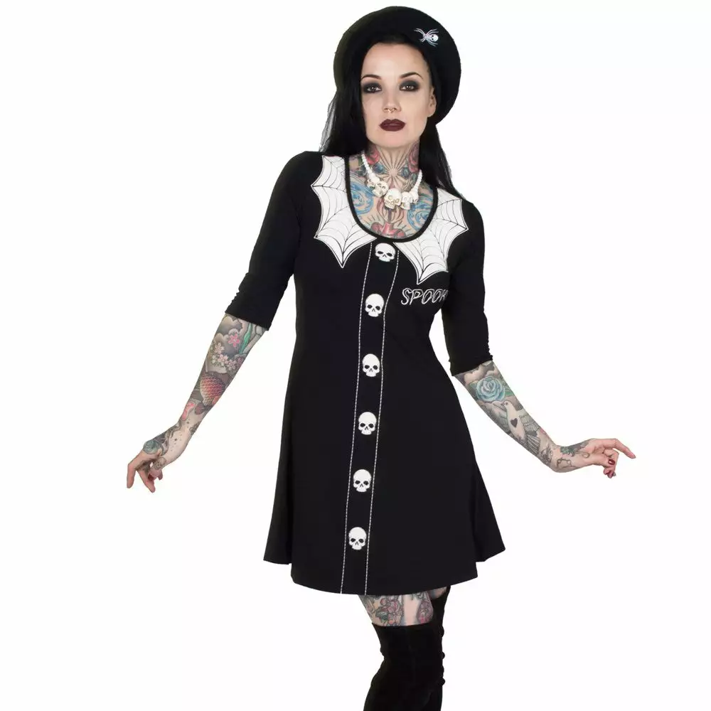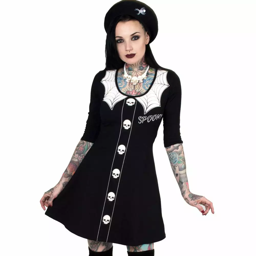 Kreepsville 666 Spooky Girl flare dress, this super cute 95% cotton 5% spandex flared dress with 3/4 length sleeve and scoop neck detail, Printed cobweb collar and printed skull button detail perfect to show your part of the family, made in the USA.
