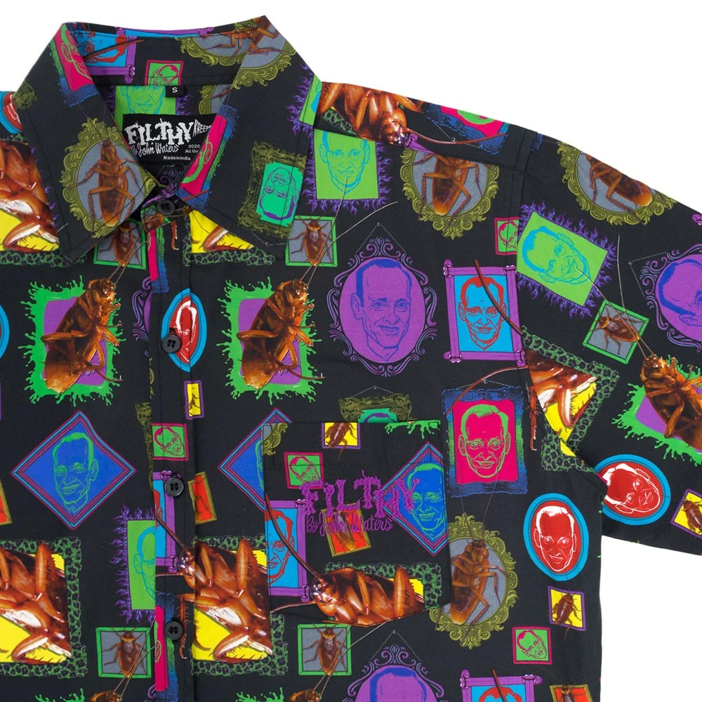 Official Filthy by John Waters Portraits Shirt men’s all over print button down shirt. All over sublimated soft feel shirt featuring all over art portraits of John Waters and of course…. roaches. Pink embroidered John Waters logo on pocket. 100% cotton shirt.