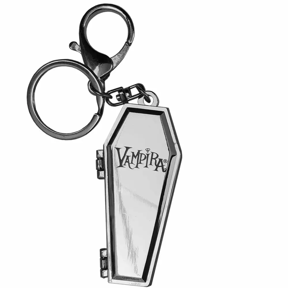 This Keychain comes with a surprise inside! Open it up to find Vampira! Keychain is approximately 7CM H X 3CM W not including chain and ring.