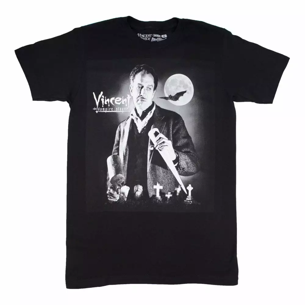 In every generation there is a chosen one. They alone will stand against the vampires, the demons and the forces of darkness. Dust some vamps in our officially licensed Vincent Price stake slayer mens tee made from 100% cotton. Male model is wearing a size men’s medium.